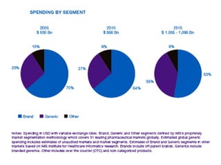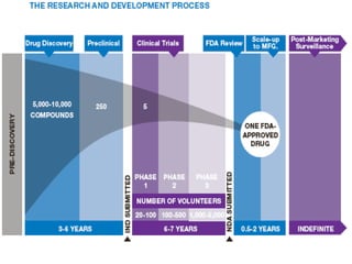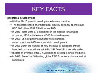 The pharmaceutical industry spends over $100 billion annually on research and development to develop new medicines and vaccines. There are hundreds of potential treatments and cures in development for diseases like cancer, diabetes, HIV/AIDS, and rare diseases. While developing a single new drug costs an average of $1.38 billion, the industry helps save healthcare systems money by reducing hospitalizations and treatment costs for conditions like cardiovascular disease. The global pharmaceutical market is expected to reach $1.1 trillion by 2015, with emerging markets in countries like India and China accounting for a growing share of worldwide spending and sales.
