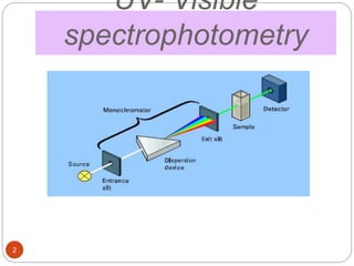 This document discusses UV-visible spectrophotometry and how it can be used for pharmaceutical analysis. It provides an overview of how light interacts with matter, describing atomic and molecular absorption. It also defines key terms like chromophores, auxochromes, and discusses the different types of electronic transitions that can occur. The document aims to explain the fundamentals of UV-visible spectrophotometry and its applications in quality control for the pharmaceutical industry.