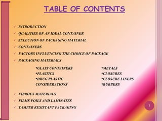 The document provides a comprehensive overview of pharmaceutical containers and closures, detailing their ideal qualities, materials used, and types of packaging. It emphasizes the importance of protecting drug contents from environmental hazards, ensuring compatibility with pharmaceuticals, and meeting regulatory standards. Additionally, it covers the selection criteria for packaging materials and types, including glass, plastics, and metals, to enhance drug stability and patient compliance.