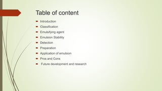 This document discusses emulsions and suppositories. It begins by defining emulsions as heterogeneous, thermolabile mixtures of two immiscible liquids made miscible by an emulsifying agent. The document then classifies emulsions, discusses emulsifying agents and emulsion stability. It describes methods for preparing and detecting emulsions. Applications of emulsions in various industries are provided. The document also defines suppositories as solid dosage forms intended for insertion into body orifices. It discusses the characteristics, formulations and bases used for different types of suppositories.