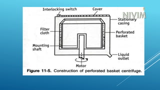 This document provides information about various filtration and centrifugation techniques used in pharmaceutical engineering. It discusses the principles, applications, and mechanisms of filtration including plate and frame filters, filter leaves, rotary drum filters, meta filters, cartridge filters, and membrane filters. It also covers the principles, objectives, and applications of centrifugation. Specific devices discussed include perforated basket centrifuges, non-perforated basket centrifuges, semi-continuous centrifuges, and super centrifuges. Theories related to filtration rate and factors influencing filtration are also summarized.
