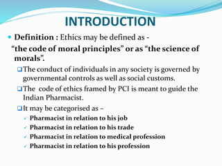 The document discusses the code of ethics for pharmacists in India as framed by the Pharmacy Council of India (PCI). It categorizes the code of ethics into four areas: pharmacists in relation to their job, trade, the medical profession, and their own profession. For each category, it lists the key aspects covered, such as the scope of pharmaceutical services, handling of prescriptions and drugs, fair trade practices, limitations of professional activity, and maintaining professional vigilance and honor. It concludes by presenting the pharmacist's oath to uphold laws and standards governing the profession and safeguarding drug distribution, keeping patient information confidential, advancing pharmacy and public health, and not bringing discredit to themselves or the profession.
