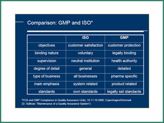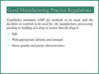 The document outlines Good Manufacturing Practice (GMP) regulations to ensure the safety, quality, and efficacy of pharmaceutical products through established standards and methods. It emphasizes the importance of quality assurance and control systems, documentation, and deviation investigations, while defining roles and responsibilities within quality control units. Additionally, the need for regular audits, compliance with regulatory requirements, and a risk-based approach to manufacturing is discussed to prevent contamination and ensure product integrity.