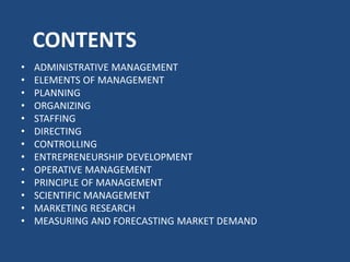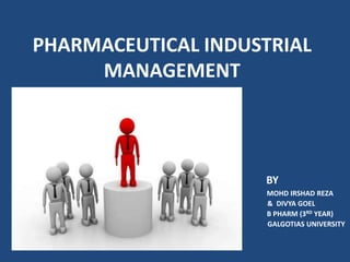 The document outlines key concepts in pharmaceutical industrial management, including administrative management, planning, organizing, staffing, directing, and controlling. It discusses elements and processes of management, the importance of effective staffing, and various forms of organization structures, such as line and functional organizations. Additionally, it highlights the principles of management, marketing research, and the significance of entrepreneurship in fostering innovation and economic growth.