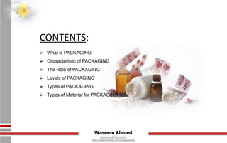 The document discusses various aspects of pharmaceutical packaging, detailing its functions, materials, and types including glass and plastic. It emphasizes the importance of packaging in protecting products, providing marketing appeal, and ensuring safety and convenience, while also outlining specific characteristics and applications of packaging materials. Additionally, it highlights the advantages and disadvantages of different types of glass and plastics used in the industry.