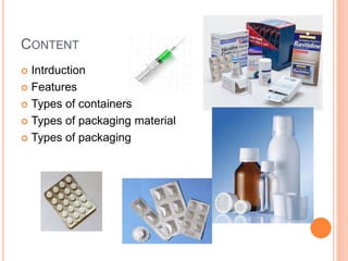 This document discusses various types of packaging materials and containers used for pharmaceuticals. It describes desirable features of pharmaceutical containers including being FDA approved, non-toxic, and protecting the product. The main types of packaging materials discussed are glass, plastic, metal, and rubber. Glass provides protection but is fragile, while plastic is flexible but permeable. Metals are impermeable yet can react with chemicals. The document also outlines different levels of pharmaceutical packaging from primary to tertiary.