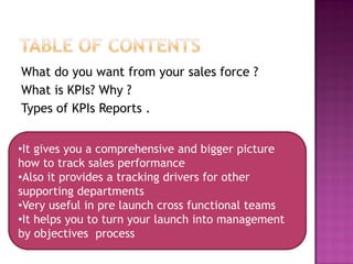 This document discusses key performance indicators (KPIs) for pharmaceutical sales forces. It provides examples of pre-launch and post-launch KPIs that can be used to track sales performance. Pre-launch KPIs include measures of physician awareness, market analysis, and regulatory approval progress. Post-launch KPIs include prescription sales, market share, message recall, customer perception, and incentives-related metrics. The document emphasizes that KPIs should provide a comprehensive picture of performance and be aligned with launch objectives.
