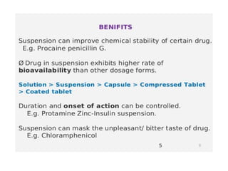 This document provides instructions for preparing different types of suspensions. It describes taking solids and triturating them in a mortar and pestle with a vehicle like tragacanth mucilage to form a smooth cream. It also discusses precipitate forming liquids, which are added slowly with rapid stirring. Another method involves mixing diluted solutions to form a precipitate that is distributed throughout the liquid by shaking. The document concludes with packaging, storage and stability considerations for suspensions.