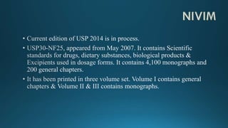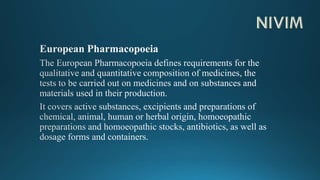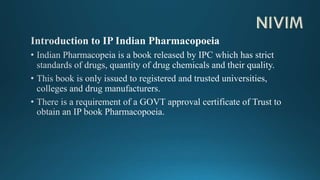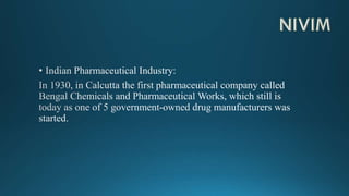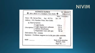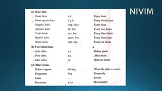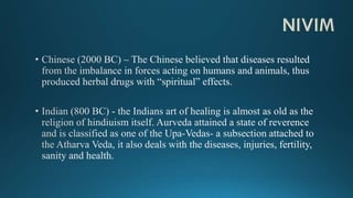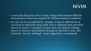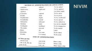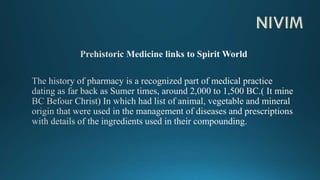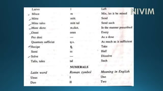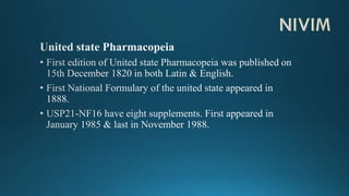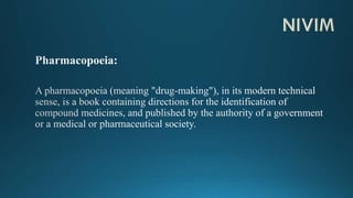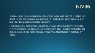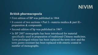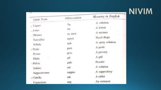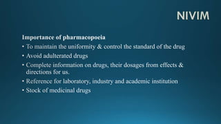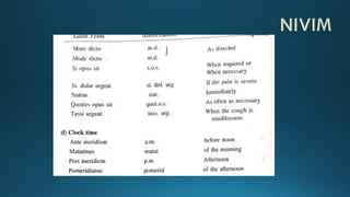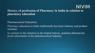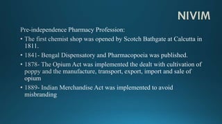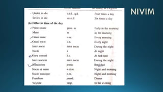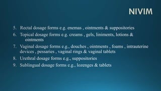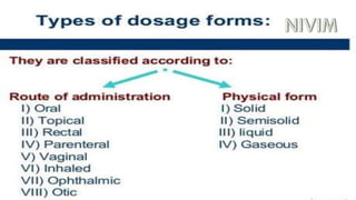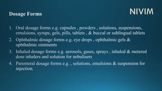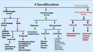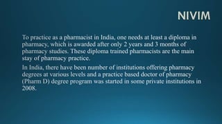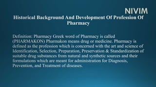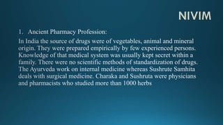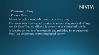 This document provides an overview of pharmacy topics including the history and development of pharmacy as a profession in India, pharmacopoeias, medicines, active pharmaceutical ingredients, excipients and their uses. It defines various dosage forms like tablets, capsules, pills, and discusses topics like prescriptions, posology, dose calculation factors and formulas. The key information covered includes the historical background of pharmacy in India, definitions of common dosage forms and medicines, factors affecting drug doses, and formulas to calculate doses for children and infants.