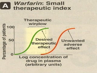 This document discusses pharmacodynamics concepts including graded dose response curves, potency, efficacy, therapeutic index, and types of antagonism. Graded dose response curves plot the magnitude of drug responses against increasing doses to determine efficacy, potency, and therapeutic index. Potency refers to the amount of drug needed to produce an effect, while efficacy refers to the magnitude of response. Therapeutic index is the ratio of lethal dose 50 (LD50) to effective dose 50 (ED50), and indicates a drug's safety margin. Antagonism can be chemical, physiological, pharmacological (competitive or noncompetitive), or biochemical in nature.