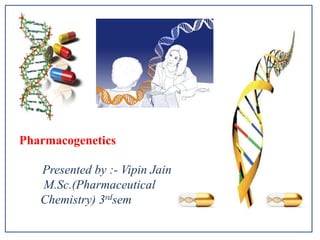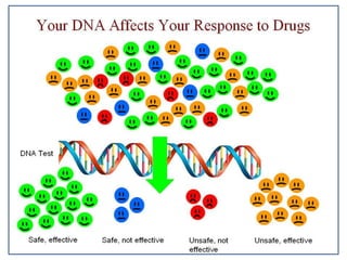 Pharmacogenetics is the study of genetic basis of variation in drug response. It aims to maximize drug efficacy and minimize toxicity. Genetic and exogenous factors contribute to differences in how individuals respond to drugs. Pharmacogenetics can help identify patient subgroups likely to respond to a drug, which aids drug development and allows for customized prescriptions to improve outcomes. It offers advantages like predicting responses, reducing adverse events, and improving rational drug design.