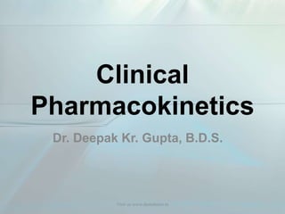 Clinical pharmacokinetics is the quantitative study of drug movement in, through, and out of the body. It involves the processes of absorption, distribution, metabolism, and excretion (ADME). Pharmacokinetics helps understand how the body affects a drug over time. Drugs are transported across biological membranes via passive diffusion, filtration, or specialized carrier transport systems. Once in circulation, drugs are distributed to tissues depending on factors like lipid solubility and plasma protein binding. The liver is the primary site of drug metabolism, which alters drugs through oxidation, reduction, hydrolysis, and conjugation to make them more polar and excretable. Understanding a drug's pharmacokinetics allows for individualization of drug therapy and