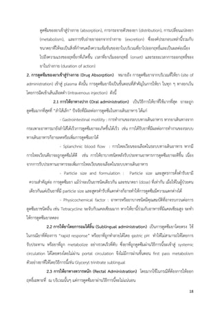(distribution), การเปลี่ยนแปลงยา (metabolism), และการขับถ่ายยาออกจากร่างกาย (excretion) ซึ่งองค์ประกอบเหล่านี้รวมกับ ขนาดยาที่ให้จะเป็นสิ่งที่กําหนดถึงความเข้มข้นของยาในบริเวณที่ยาไปออกฤทธิ์และเป็นผลต่อเนื่อง ไปถึงความแรงของฤทธิ์ยาที่เกิดขึ้น เวลาที่ยาเริ่มออกฤทธิ์ (onset) และระยะเวลาการออกฤทธิ์ของ ยาในร่างกาย (duration of action) 2. การดูดซึมของยาเข้าสู่ร่างกาย (Drug Absorption) หมายถึง การดูดซึมยาจากบริเวณที่ให้ยา (site of administration) เข้าสู่ plasma ดังนั้น การดูดซึมยาจึงเป็นขั้นตอนที่สําคัญในการให้ยา ในทุก ๆ ทางยกเว้น โดยการฉีดเข้าเส้นเลือดดํา (intravenous injection) ดังนี้ 2.1 การให้ยาทางปาก (Oral administration) เป็นวิธีการให้ยาที่ใช้มากที่สุด ยาจะถูก ดูดซึมมากที่สุดที่ “ลําไส้เล็ก” ปัจจัยที่มีผลต่อการดูดซึมในทางเดินอาหาร ได้แก่ - Gastrointestinal motility : การทํางานของระบบทางเดินอาหาร หากยาเดินทางจาก กระเพาะอาหารมายังลําไส้ได้เร็วการดูดซึมยาจะเกิดขึ้นได้เร็ว เช่น การได้รับยาที่มีผลต่อการทํางานของระบบ ทางเดินอาหารก็อาจลดหรือเพิ่มการดูดซึมยาได้ - Splanchnic blood flow : การไหลเวียนของเลือดในระบบทางเดินอาหาร หากมี การไหลเวียนดียาจะถูกดูดซึมได้ดี เช่น การให้ยาบางชนิดหลังรับประทานอาหารการดูดซึมยาจะดีขึ้น เนื่อง จากการรับประทานอาหารจะเพิ่มการไหลเวียนของเลือดในระบบทางเดินอาหาร - Particle size and formulation : Particle size และสูตรการตั้งตํารับยามี ความสําคัญต่อ การดูดซึมยา แม้ว่าจะเป็นยาชนิดเดียวกัน และขนาดยา (dose) ที่เท่ากัน เมื่อให้ในผู้ป่วยคน เดียวกันแต่เป็นยาที่มี particle size และสูตรตํารับที่แตกต่างก็อาจทําให้การดูดซึมมีความแตกต่างได้ - Physicochemical factor : อาหารหรือยาบางชนิดมีคุณสมบัติที่อาจรบกวนต่อการ ดูดซึมยาชนิดอื่น เช่น Tetracycline จะจับกับแคลเซียมมาก หากให้ยานี้ร่วมกับอาหารที่มีแคลเซียมสูง จะทํา ให้การดูดซึมยาลดลง 2.2 การให้ยาโดยการอมใต้ลิ้น (Sublingual administration) เป็นการดูดซึมยาโดยตรง ใช้ ในกรณียาที่ต้องการ “rapid response” หรือยาที่ถูกทําลายได้โดย gastric pH ทําให้ไม่สามารถให้โดยการ รับประทาน หรือยาที่ถูก metabolize อย่างรวดเร็วที่ตับ ซึ่งยาที่ถูกดูดซึมผ่านวิธีการนี้จะเข้าสู่ systemic circulation ได้โดยตรงโดยไม่ผ่าน portal circulation จึงไม่มีการผ่านขั้นตอน first pass metabolism ตัวอย่างยาที่ให้โดยวิธีการนี้เช่น Glyceryl trinitrate sublingual 2.3 การให้ยาทางทวารหนัก (Rectal Administration) โดยมากใช้ในกรณีที่ต้องการให้ออก ฤทธิ์เฉพาะที่ ณ บริเวณนั้นๆ แต่การดูดซึมยาผ่านวิธีการนี้จะไม่แน่นอน