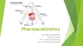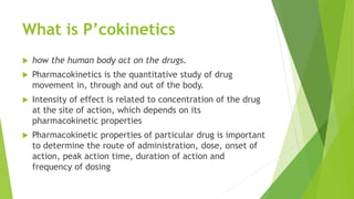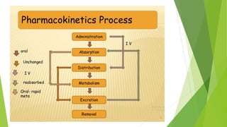 The document discusses pharmacokinetics, the quantitative study of drug movement in the body, emphasizing the importance of drug absorption, distribution, metabolism, and excretion. Key concepts include membrane transport mechanisms, factors affecting drug bioavailability, and the influence of age and genetics on drug metabolism and tolerance. Additionally, it highlights the significance of kidney and liver function in drug elimination from the body.