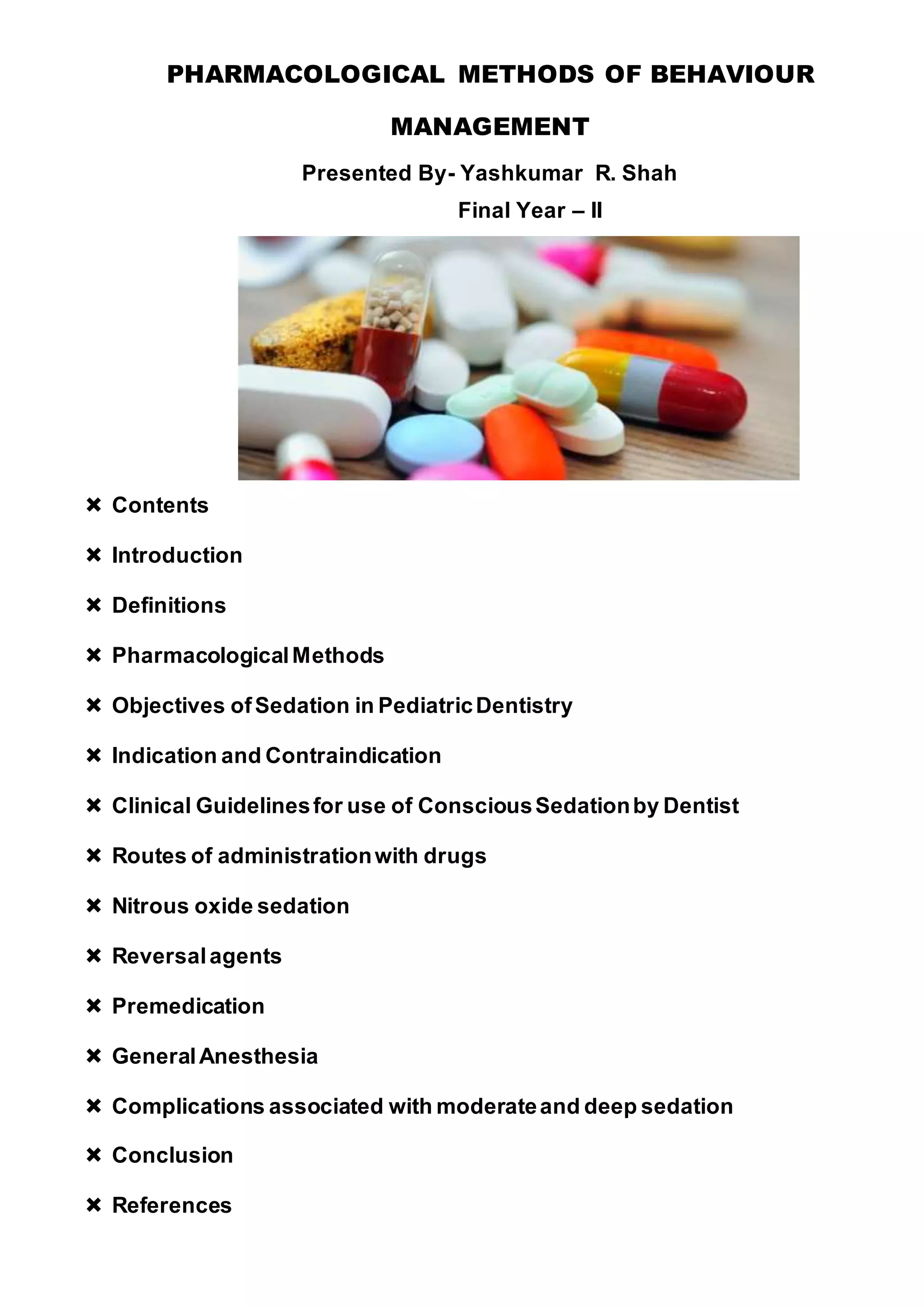 The document discusses pharmacological methods for behavior management in pediatric dentistry, including conscious sedation, general anesthesia, and various medications used for sedation. It outlines the objectives, indications, contraindications, and clinical guidelines for sedation procedures, emphasizing the importance of properly managing children's anxiety and behavior during dental treatments. Key sections include details on nitrous oxide sedation, premedication options, and considerations for safely administering anesthesia to young patients.