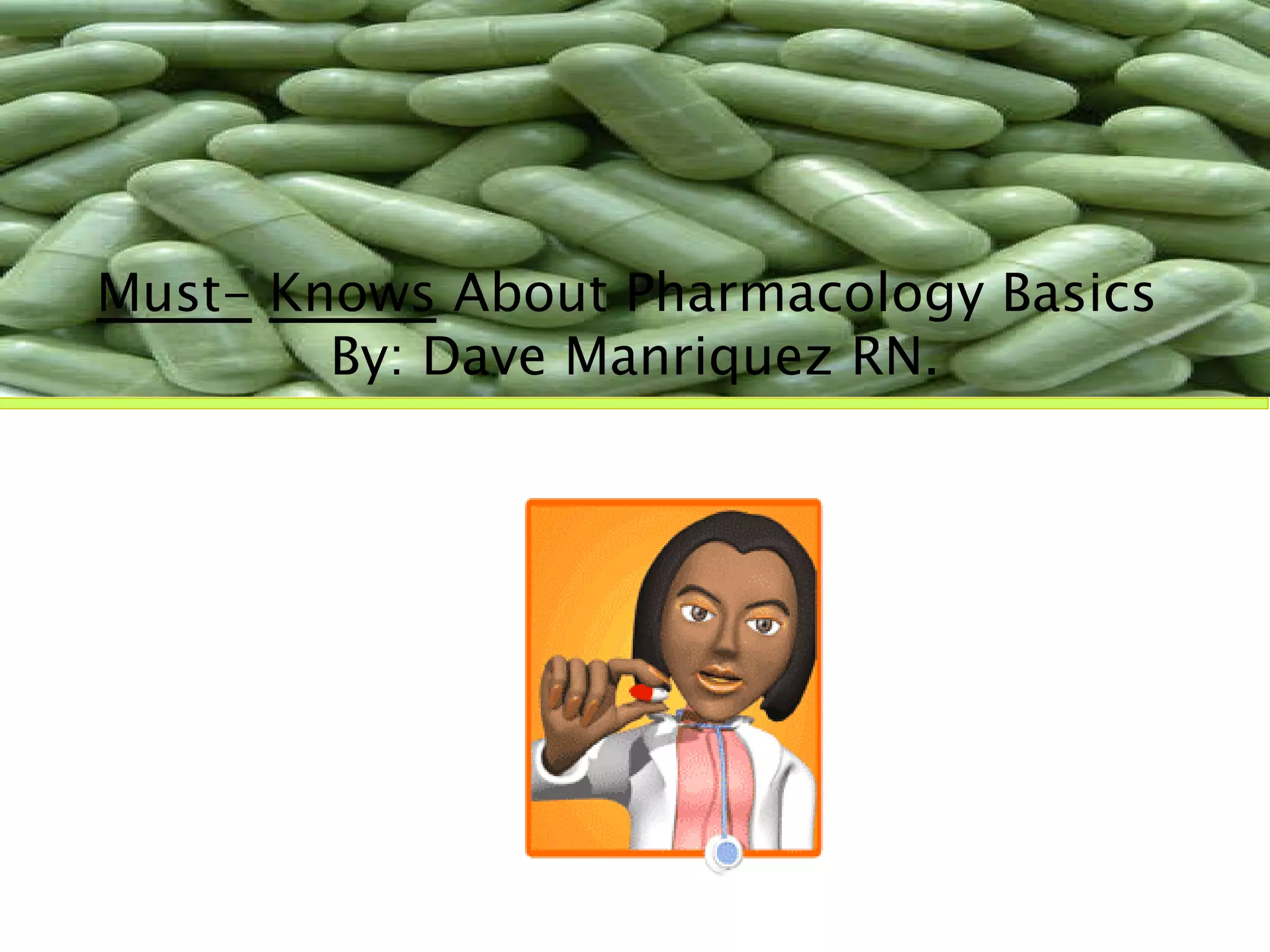 This document provides an overview of pharmacology basics including definitions of key terms, drug categories, pharmacodynamics, pharmacokinetics, drug computations, and examples of nursing teachings related to over-the-counter medications and sample patient cases. Key concepts covered include drug absorption, distribution, metabolism, excretion, factors influencing drug effects, allergic reactions, and conversions between units of measurement for drug dosages.