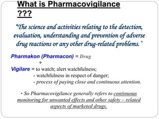 This document discusses pharmacovigilance, which involves monitoring the safety of drugs after they have been approved. It defines pharmacovigilance and explains why it is needed given limitations of clinical trials. It describes types of adverse drug reactions and how they are classified. It outlines the goals and processes of pharmacovigilance programs, including reporting adverse reactions, conducting causality assessments, and submitting periodic safety update reports. The overall aim is to ensure safe and effective use of medicines through continual monitoring and regulatory action.