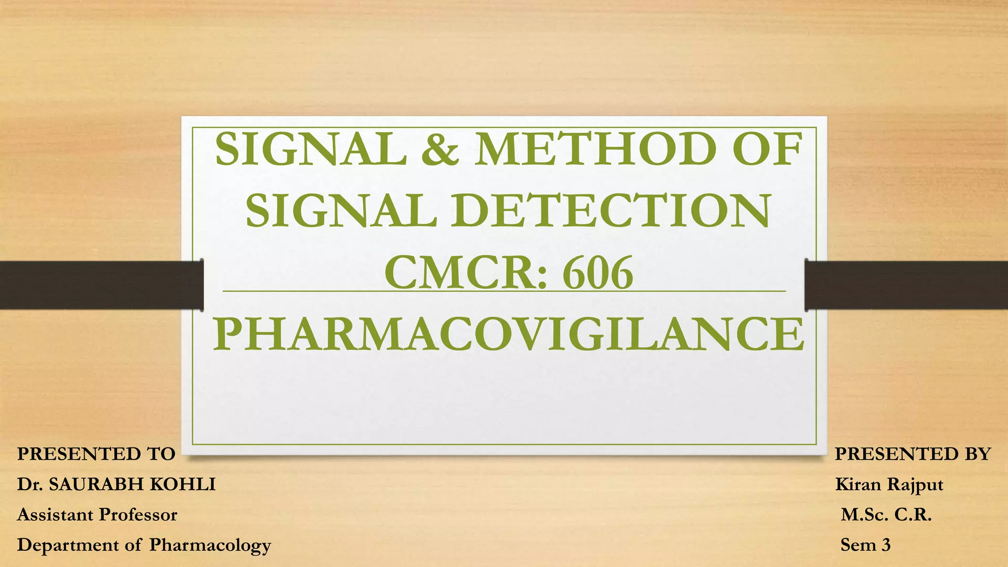 The document discusses signal detection in pharmacovigilance, defining a signal as information suggesting a potential causal relationship between an adverse event and a drug that necessitates further investigation. It emphasizes traditional methods like individual case reviews and aggregate analysis, along with data mining algorithms as modern techniques for detecting safety signals from adverse reaction data. The primary goal of signal detection is to identify and describe suspected harms related to medication use, drawing evidence from spontaneous reports and other sources.