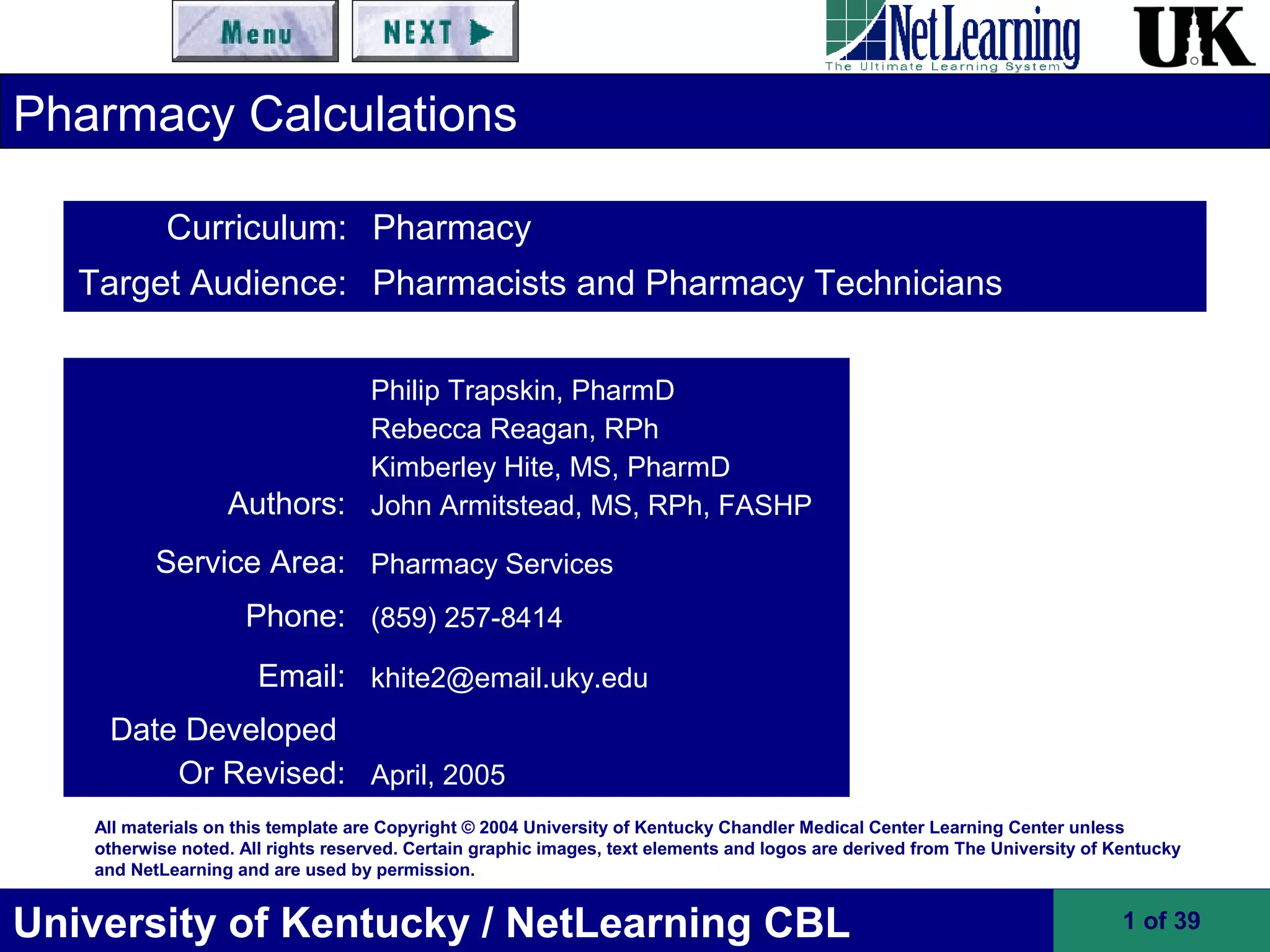 This document provides an overview and objectives for a continuing education learning module on pharmacy calculations for pharmacists and pharmacy technicians. It covers reviewing basic mathematics concepts like numerals, numbers, fractions, decimals, percentages, and units of measure in both the metric and other common systems. It also reviews ratios, proportions, concentration, dilution, and performing intravenous drip rate calculations. A number of example problems and solutions are provided to illustrate these concepts. The document is intended to be an educational resource for reviewing and practicing essential skills for accurately performing pharmacy calculations.