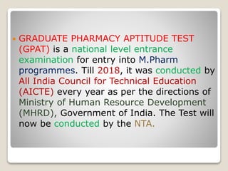 The Graduate Pharmacy Aptitude Test (GPAT) is a national level entrance exam for admission to M.Pharm programs. It was previously administered by AICTE annually but is now conducted by the National Testing Agency. GPAT is a 3-hour computer-based test that allows institutions to select suitable pharmacy graduates for M.Pharm programs. Indian citizens who have completed a 4-year B.Pharmacy degree or are in their final year are eligible to take GPAT, and scholarships may be awarded based on the exam score.