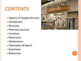 The document discusses aspects of pharmacy services in hospitals. It outlines the different types of services including line services like emergency care, inpatient and outpatient services. Supportive services include the pharmacy, laboratory, and radiology. The pharmacy purchases and dispenses all medications used in the hospital. A well-staffed pharmacy department headed by a qualified pharmacist is crucial for ensuring the right medications are available when needed. The pharmacist works closely with medical staff and a drug committee to establish treatment protocols and formularies. Effective pharmacy services are essential for patient treatment and care in hospitals.