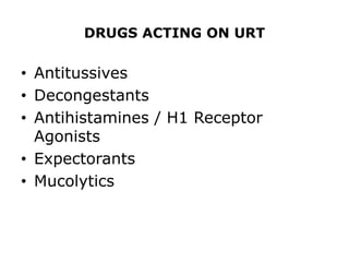 This document summarizes drugs that affect the respiratory system, focusing on those acting on the upper respiratory tract (URT). It discusses antitussives, which suppress cough reflexes by acting on the medulla's cough center and anesthetizing cough receptors. Antitussives are indicated for treating nonproductive cough from conditions like colds, sinusitis, and pneumonia. Nursing considerations for antitussives include maintaining airway patency, assessing breath sounds, determining cough characteristics, encouraging fluid intake, and reporting persistent or painful cough. The document also briefly mentions decongestants as another drug acting on the URT.