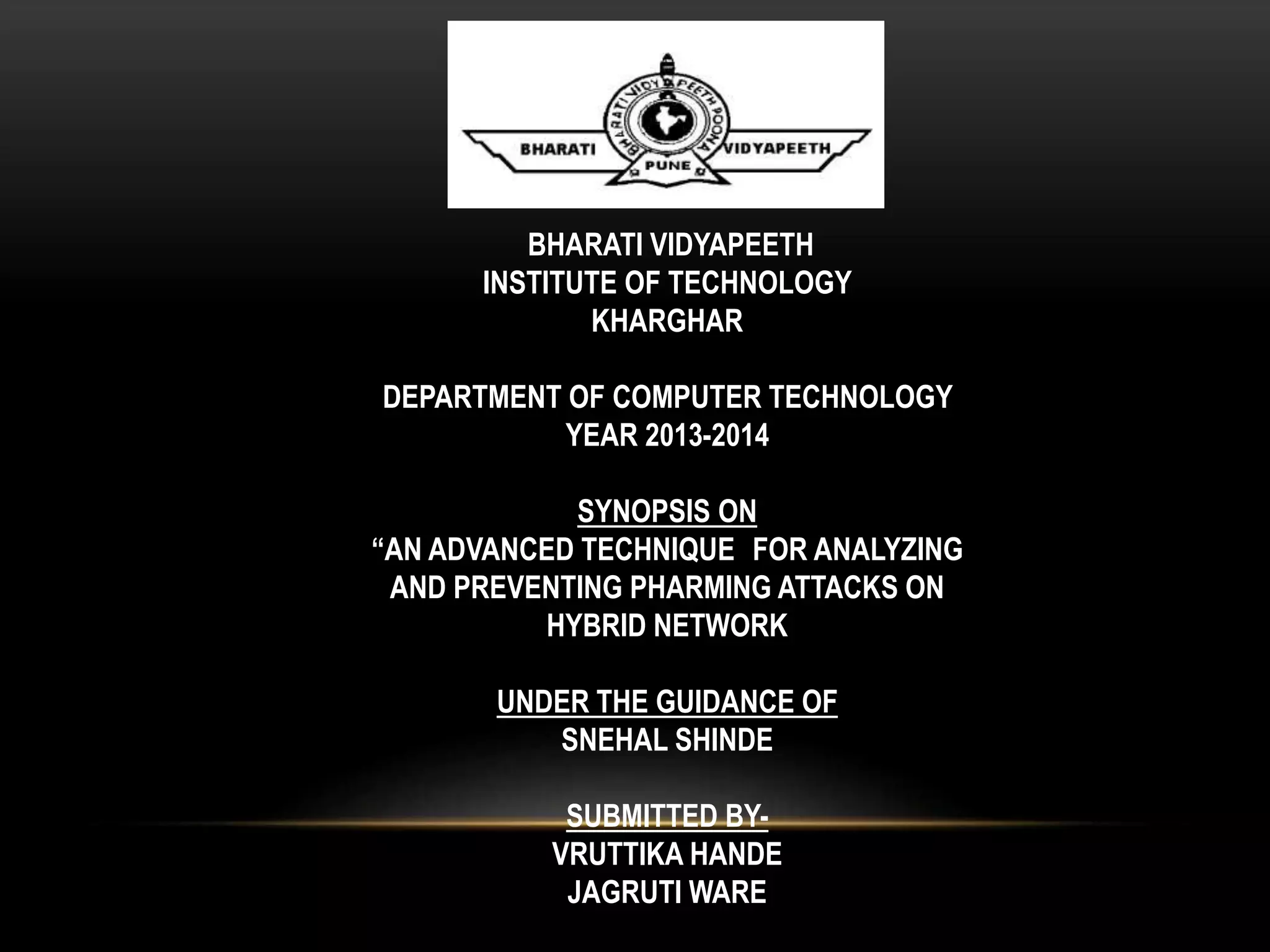 This document summarizes a synopsis on analyzing and preventing pharming attacks on hybrid networks. The objectives are to analyze pharming attacks using Java and prevent users from losing confidential information. Pharming attacks are increasing and are an enhanced version of phishing attacks. The proposed system detects pharming attacks through dual analysis of IP address checks and web page content comparisons. It uses character-level and word-level N-gram algorithms to compare legitimate and fraudulent pages. The system was implemented in Java due to its portability across operating systems. The goal is to avoid attacks from fake sites and prevent information loss.