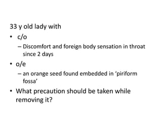 1. A 33-year-old woman presented with a foreign body sensation in her throat for two days. Upon examination, an orange seed was found embedded in her piriform fossa.