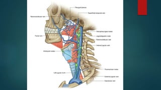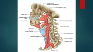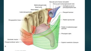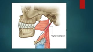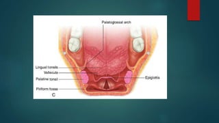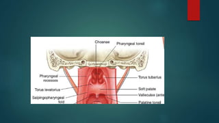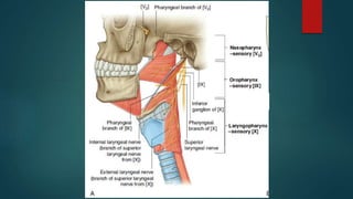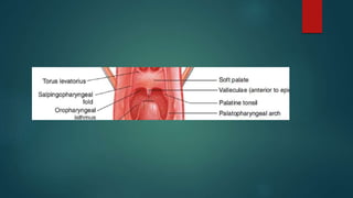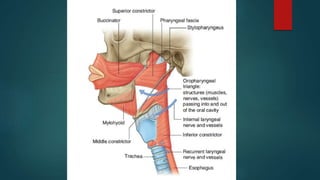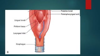 The pharynx is a musculofascial tube that connects the oral and nasal cavities to the larynx and esophagus. It is divided into three regions - the nasopharynx, oropharynx, and laryngopharynx. Various structures open into the pharynx, including the choanae, oral cavity, and larynx. The pharynx contains muscles that allow it to constrict during swallowing to push food into the esophagus. It is supplied by arteries, veins, lymphatics and nerves including the vagus and glossopharyngeal nerves.