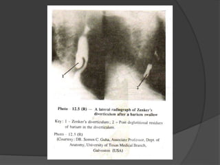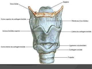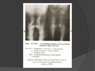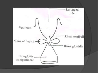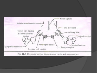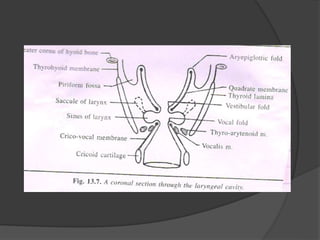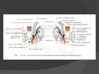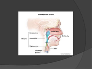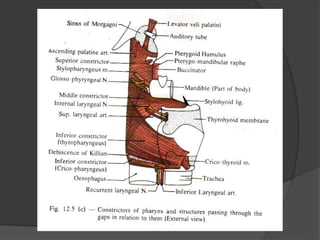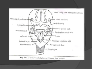 This document provides a detailed overview of the anatomy of the pharynx and related structures. It describes the pharynx as a musculomembranous tube divided into 3 parts - nasopharynx, oropharynx, and laryngopharynx. It outlines the walls, openings, layers, blood supply, nerve supply, and development of each part. Related structures like the tonsils, auditory tubes, and larynx are also described in detail, including their cartilages, walls, openings, blood supply, nerve supply, and clinical applications.