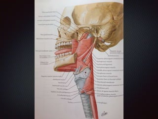 The pharynx is about 12 cm long and extends from the base of the skull to the lower border of the cricoid cartilage. It is divided into 3 parts: the nasopharynx, oropharynx, and laryngopharynx. The nasopharynx is behind the nasal cavity and opens into the oropharynx. The oropharynx extends from the soft palate to the epiglottis and opens into the oral cavity. The laryngopharynx extends from the epiglottis to the lower border of the cricoid cartilage. Three pairs of constrictor muscles and other muscles like the stylopharyngeus allow the pharynx to
