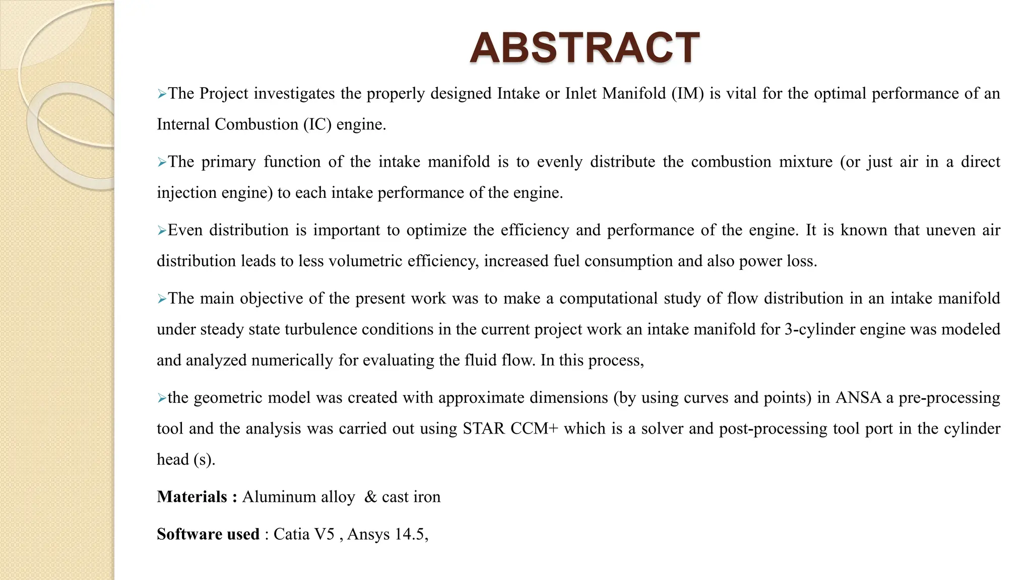 The document discusses the design and analysis of an intake manifold for an internal combustion engine using various materials. It aims to optimize the intake manifold design to maximize volumetric efficiency and even air distribution across cylinders. The methodology involves analytical calculations for different materials, CAD modeling, CAE analysis for stresses and vibrations, CFD analysis of air flow, and optimization of the design. The goal is to develop an efficient intake manifold model by varying materials and analyzing fluid flow characteristics numerically and comparing to experimental results.