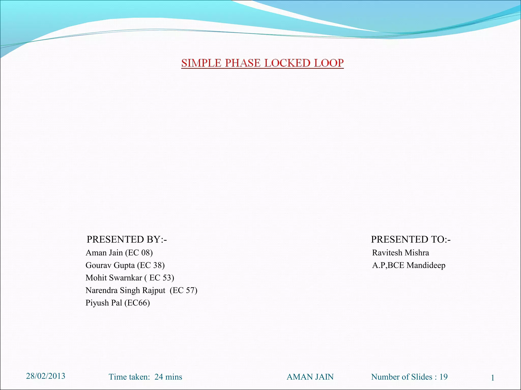 This presentation summarizes the key aspects of a Phase Locked Loop (PLL) circuit. It was presented by Aman Jain, Gourav Gupta, Mohit Swarnkar, Narendra Singh Rajput, and Piyush Pal to Ravitesh Mishra. The presentation outlines what a PLL is, the main components of a PLL including the phase detector, filter, and voltage controlled oscillator. It also discusses the locked condition of a PLL, the dynamics and transient response of PLL circuits, and applications of PLLs such as frequency multiplication, jitter reduction, and clock recovery.