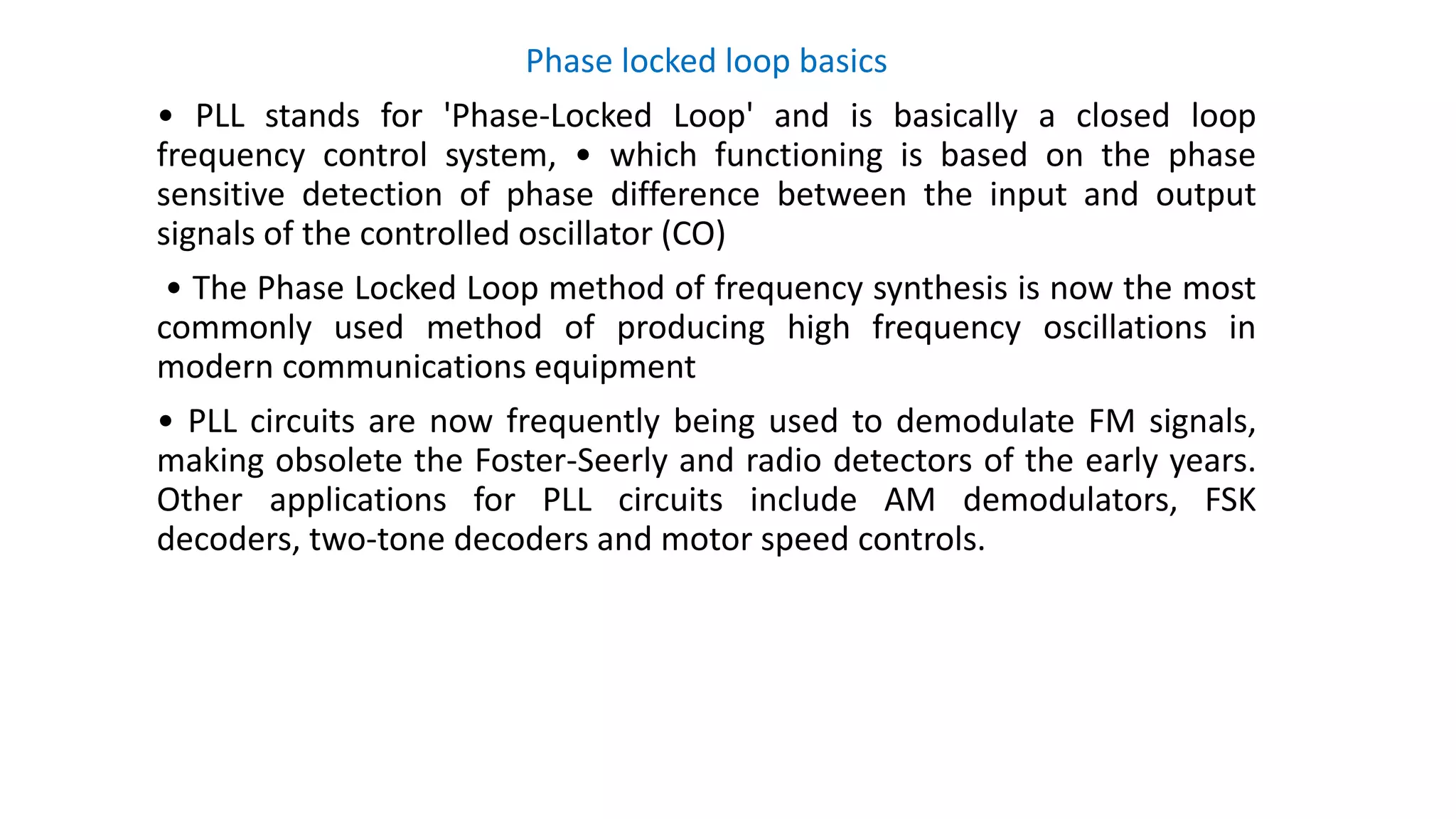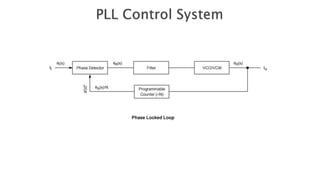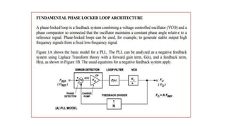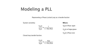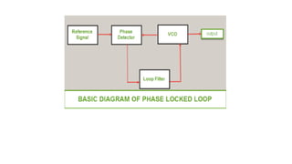 The document discusses the basics of phase locked loops (PLL). It describes PLLs as closed loop frequency control systems that use phase sensitive detection to minimize the phase difference between an input signal and a voltage controlled oscillator (VCO) output signal. The key components of a basic PLL are identified as a phase comparator/detector, loop filter, and VCO. The phase comparator compares the input and output signals and generates a voltage based on their phase difference. The loop filter removes signal components from the phase comparator output before feeding it to the VCO. The VCO then generates the output signal with a frequency controlled by the input voltage. An important property of PLLs is that the input and output frequencies are exactly equal when phase locked