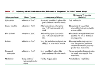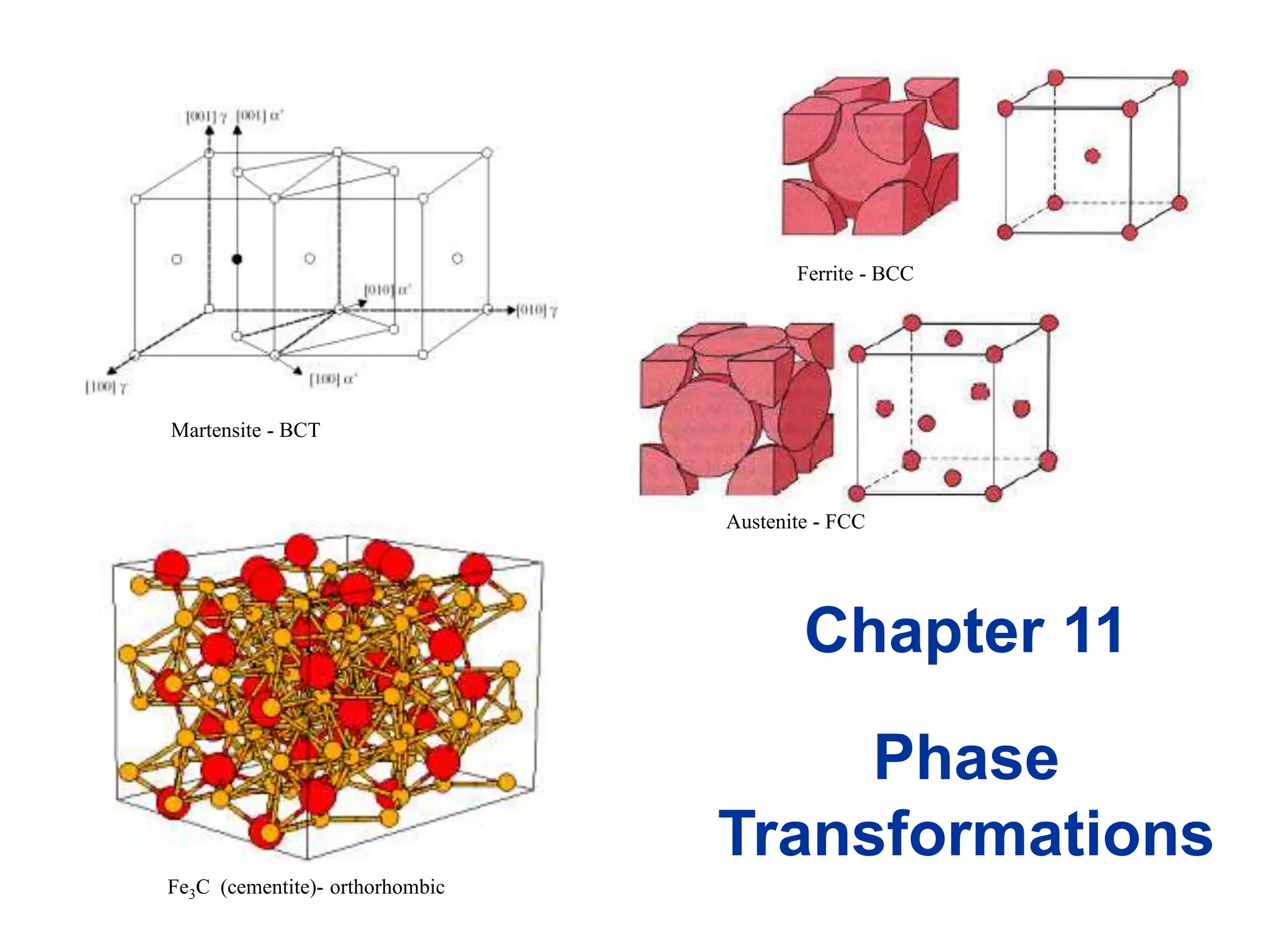 - The different crystal structures of phases like austenite, ferrite, and cementite.