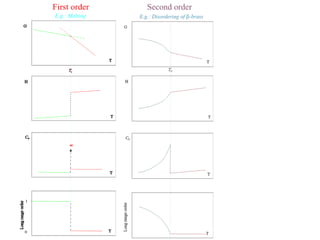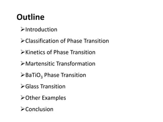 Phase transitions can be classified based on their order, mechanism, and thermodynamics. First order transitions involve a discontinuity in the first derivative of Gibbs free energy. Second order transitions have a continuous first derivative but discontinuity in the second derivative. Reconstructive transitions involve major structure reorganization while displacive transitions involve bond distortion. The kinetics of phase transitions involve nucleation and growth. Martensitic transformations occur via shear without diffusion. The BaTiO3 transition from cubic to tetragonal structure results in it becoming ferroelectric below 120°C. Glass transitions occur when liquids are cooled too fast to crystallize, becoming supercooled liquids called glasses.