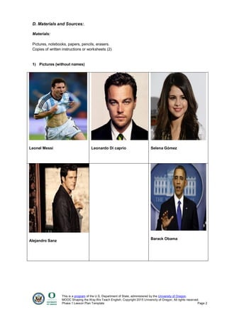 This lesson plan aims to teach 20 high school students in Argentina about describing famous people. Students will work in groups to research famous individuals like Messi, DiCaprio, and Obama using online sources. They will fill out a worksheet with details and present their findings. Later, students will match descriptions to pictures and read sentences about the people aloud. The teacher will provide formative feedback and students will listen to audio clips to practice comprehension. The goal is for students to gain experience finding online information in English and describing others.