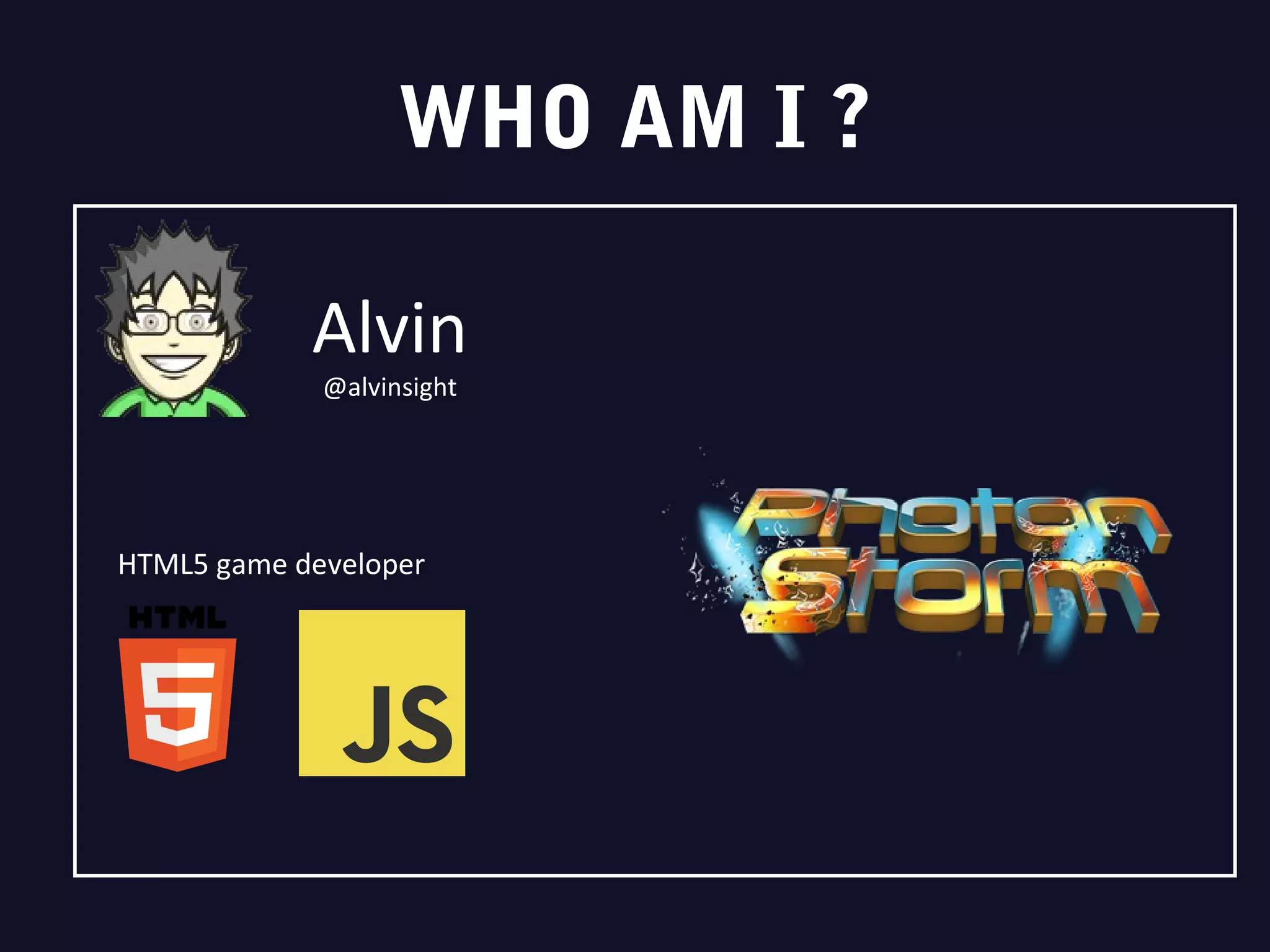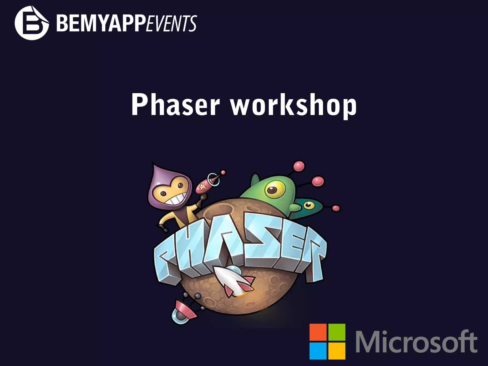 The document outlines a Phaser workshop led by developer Alvin, focusing on the Phaser framework for HTML5 game development. It highlights Phaser's features, including its use of Pixi.js as a renderer, mobile-friendliness, and built-in physics engines. The document also provides sample code snippets for creating a basic game structure using Phaser.