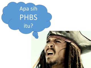 PHBS (Perilaku Hidup Bersih dan Sehat) di sekolah terdiri dari 8 indikator kebiasaan positif yang dilakukan siswa dan staf sekolah untuk mencegah penyakit dan menjaga lingkungan sekolah bersih dan sehat. Indikator-indikator tersebut adalah mencuci tangan, memilih makanan sehat di kantin, membuang sampah pada tempatnya, berolahraga, menimbang berat badan secara berkala, menjauhi rokok