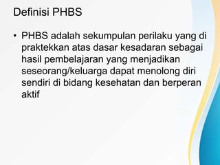 Perilaku Hidup Bersih dan Sehat (PHBS) adalah sekumpulan perilaku yang mendorong individu dan rumah tangga untuk meningkatkan kesehatan melalui kesadaran dan tindakan preventif. Tujuan PHBS adalah untuk meningkatkan pengetahuan dan kemampuan anggota rumah tangga dalam menjaga kesehatan, yang berdampak positif pada kesehatan anak dan produktivitas keluarga. Beberapa indikator dan kegiatan PHBS termasuk penggunaan air bersih, pencucian tangan, dan pelaksanaan sosialisasi untuk mengatasi masalah kesehatan di masyarakat.