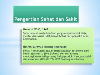 Dokumen ini membahas tentang perilaku hidup bersih dan sehat (PHBS) yang bertujuan mencegah penyakit dan meningkatkan kesehatan. Terdapat 10 indikator PHBS yang mencakup persalinan oleh tenaga kesehatan, pemberian ASI eksklusif, penggunaan air bersih, mencuci tangan, serta pentingnya sanitasi dan konsumsi makanan sehat. Penekanan pada penerapan PHBS diharapkan dapat meningkatkan kualitas kesehatan masyarakat.