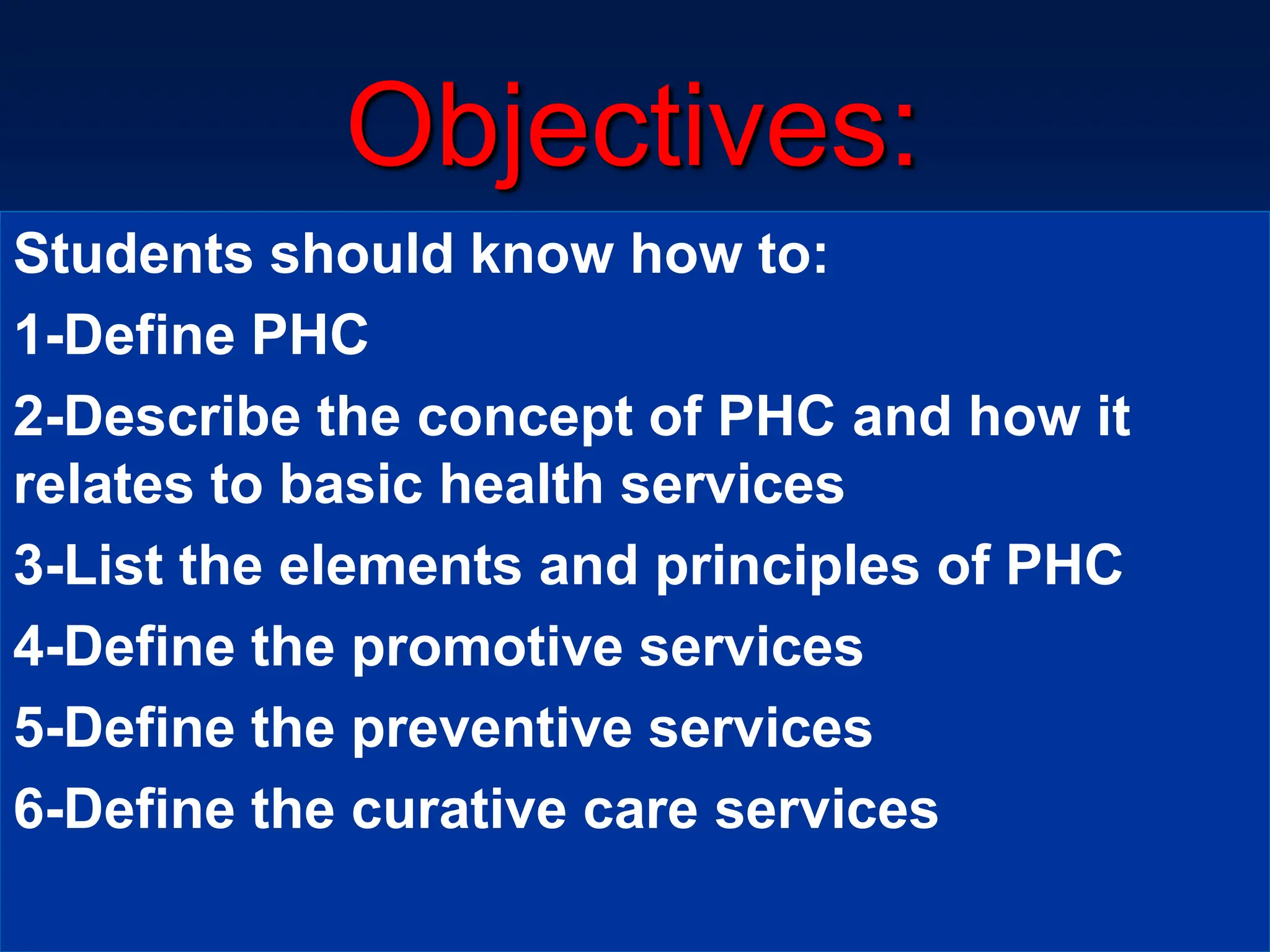 The document outlines the objectives and principles of Primary Health Care (PHC) as established by the Alma-Ata conference in 1978, promoting health for all through essential, accessible health services. Key components of PHC include health education, nutrition, safe water, maternal and child health, and immunization, which are categorized into promotive, preventive, and curative services. The document emphasizes the principles of equity, community participation, intersectoral coordination, and appropriate technology in implementing PHC strategies.