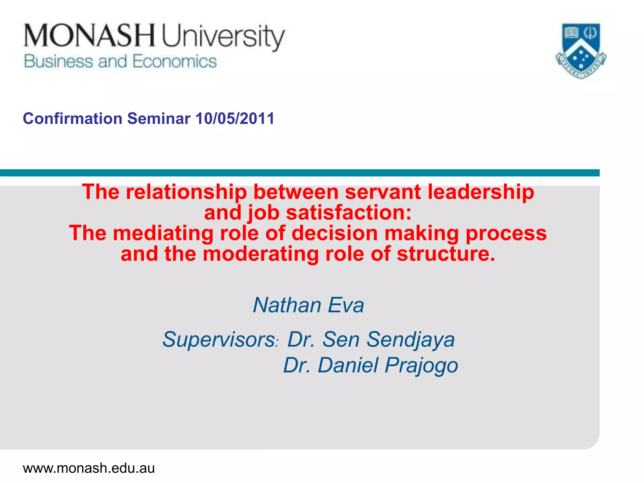 This document provides an overview of Nathan Eva's confirmation seminar which examines the relationship between servant leadership and job satisfaction, with a focus on the mediating role of decision making processes and the moderating role of organizational structure. The study aims to address gaps in the literature by exploring how servant leadership influences decision making and how organizational factors like centralization and formalization impact these relationships. Quantitative surveys of managers will assess servant leadership styles, decision making, job satisfaction, and structural variables, with the goal of collecting a sample of 200-250 for analysis using structural equation modeling.
