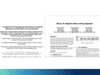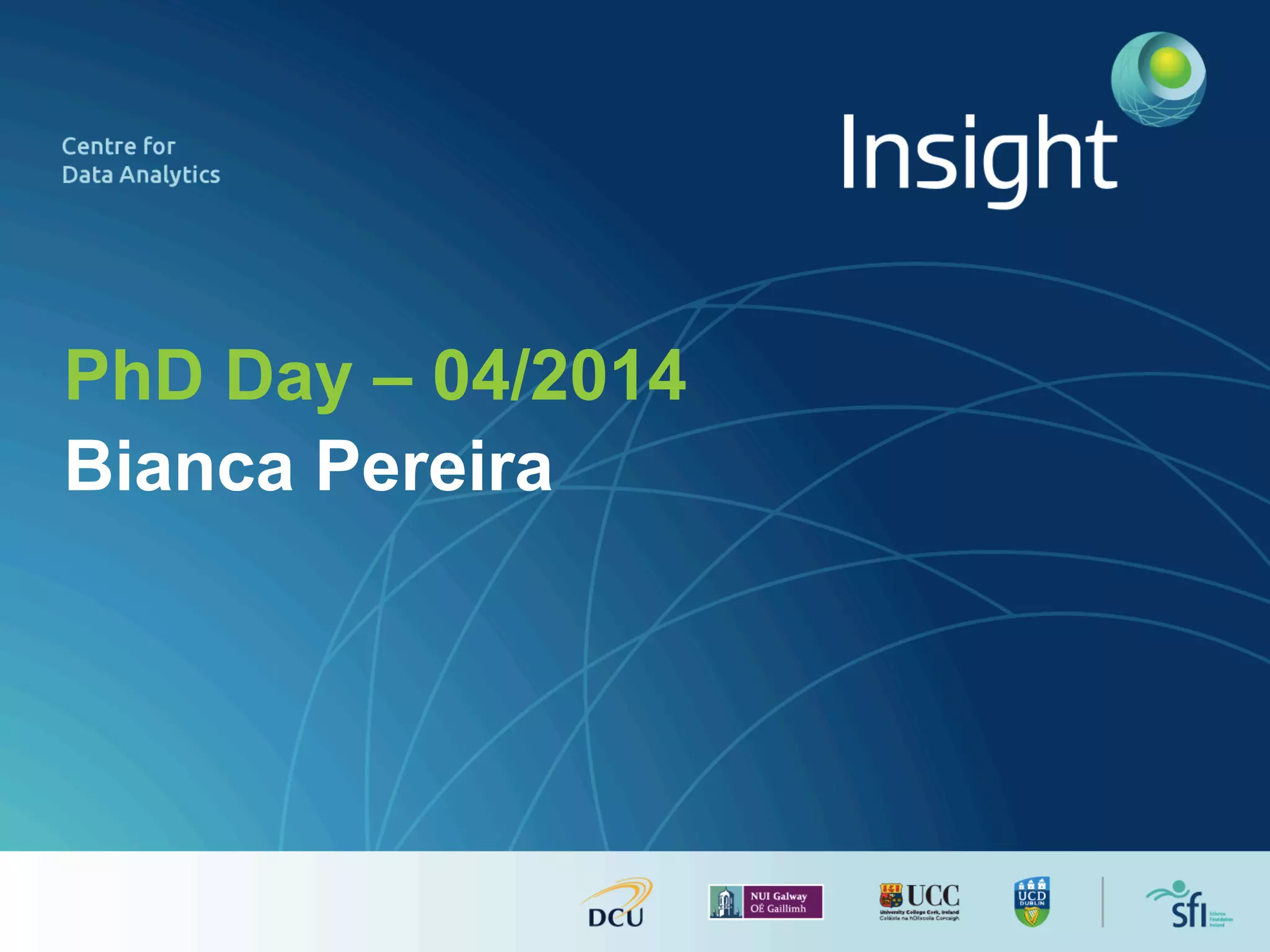 The document outlines the PhD research of Bianca Pereira, focusing on entity linking, which involves grounding entity mentions in documents to knowledge base entries. It discusses the challenges of disambiguation in large knowledge bases and proposes solutions like approximation algorithms and dimensionality reduction to improve accuracy and efficiency. The research questions and hypotheses aim to explore the potential for manageable disambiguation times regardless of knowledge base size, as well as the effectiveness of exact algorithms in this context.