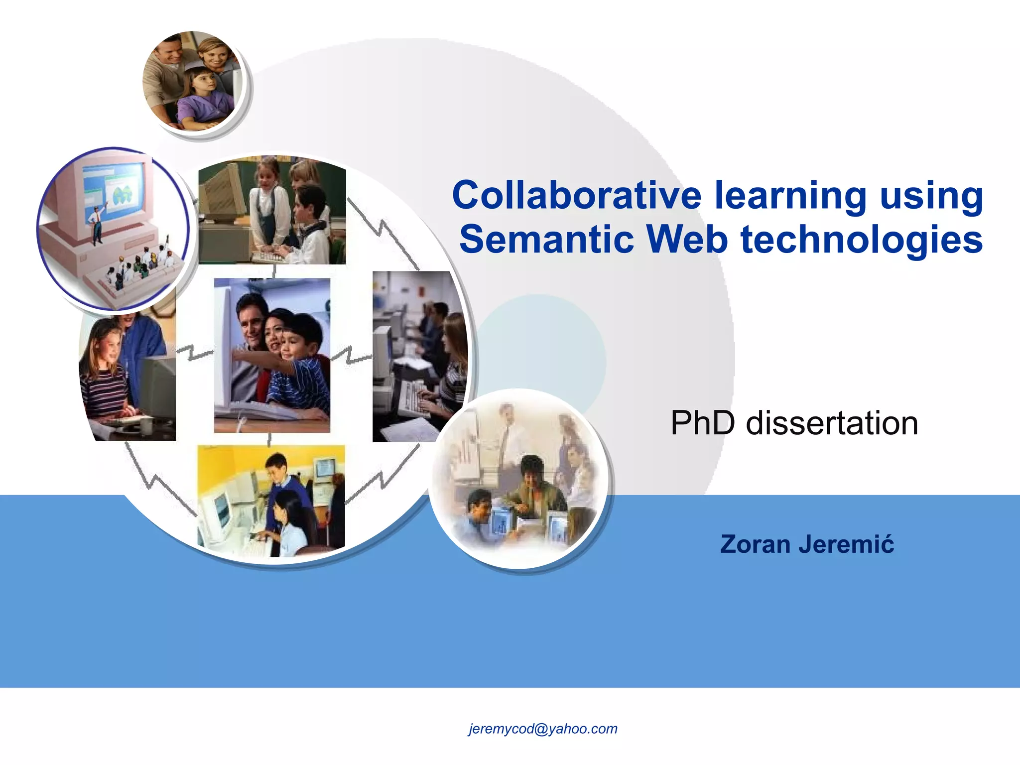 This document summarizes Zoran Jeremić's PhD dissertation on using semantic web technologies to support collaborative learning. It outlines the basic concepts of collaborative learning and semantic web technologies. It then describes the DEPTHS system, which uses an ontology and semantic web services to provide context-aware learning resources and tools to support project-based learning of software design patterns. An evaluation with students found the DEPTHS approach was generally effective for learning patterns and the integrated tools were useful.