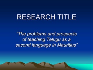 This document presents an e-poster for a research study on the problems and prospects of teaching Telugu as a second language in Mauritius. The study aims to identify difficulties teachers face in teaching Telugu and learning difficulties students face. It also aims to find solutions and investigate current teaching methodology. The researcher plans to survey Telugu students and teachers, analyze textbooks, and use interviews, questionnaires, observations, and triangulation to collect and analyze data. The expected outcomes are insights into challenges, their impact, and effective ways to address issues to benefit teachers, students, and other stakeholders in improving Telugu language teaching and learning.