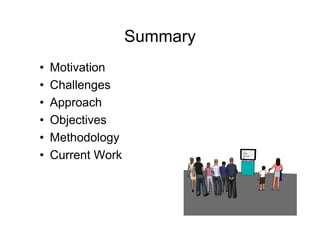 This document discusses mixed-initiative interaction approaches for public displays. It outlines the motivation to make displays more integrated with their surroundings. Challenges include inferring the social context and providing recognizable interactive features. The approach involves using "digital footprints" from interactions to help displays characterize places and adapt. Objectives are to study interaction mechanisms that generate useful footprints and how to present features understandably. The methodology examines footprints, adapts interface conventions, and tests solutions in real settings. Current work analyzes a framework for context-aware adaptation and interaction conventions from standard systems.
