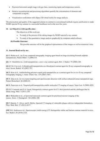 The document is a tentative research proposal for a PhD program studying the use of MARS spectral X-ray scanning to determine human body fat content. The research aims to use MARS scanning, which collects spectral X-ray information, to quantify fat and other tissues in 3D images with improved diagnostic information over traditional X-rays. The goals are to develop methods to capture high-resolution spectral CT images of body parts and validate the accuracy of fat measurement against standard methods. The objectives are to study the image capture process using MARS scanning and analyze the quantitative images generated with software.