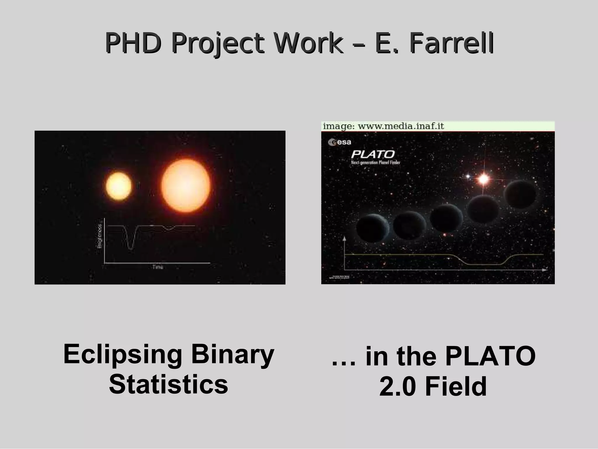 This document discusses using population synthesis modeling to estimate the number of eclipsing binary stars that could contaminate exoplanet detections in the PLATO 2.0 mission. It describes generating synthetic binary star systems, evolving them, analyzing their light curves to determine transit depths, and applying this to simulated PLATO fields to output the expected number of eclipsing binaries at different transit depths. The results from simulations of random inclinations for binaries in patches of the PLATO northern field are also presented. Future work discussed includes calculating blend probabilities and applying the method to other surveys.
