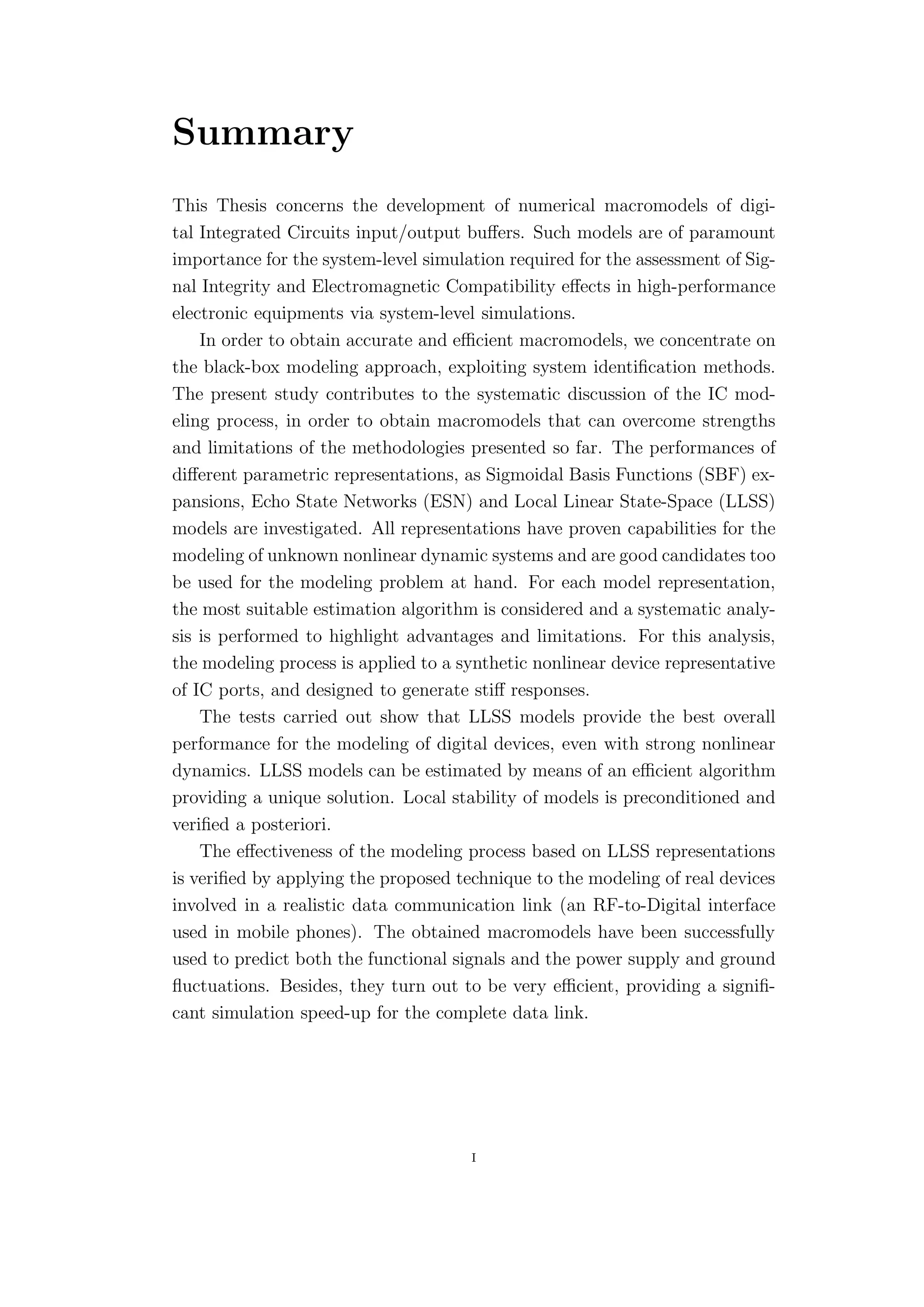 This thesis concerns the development of numerical macromodels of digital integrated circuits input/output buffers using system identification methods. Chapter 1 introduces the need for accurate and efficient macromodels of active devices for system-level simulation of signal integrity and electromagnetic compatibility effects in electronic equipment. Chapter 2 reviews existing modeling approaches for integrated circuits. Chapter 3 discusses the parametric modeling process including model selection, identification signals, parameter estimation, validation and implementation. Chapter 4 presents different parametric model representations considered: Sigmoidal Basis Functions, Echo State Networks, and Local Linear State-Space models. Chapter 5 assesses the performance of these models on a test device, showing Local Linear State-Space models provide the best results. Chapter 6 applies the modeling process